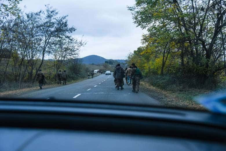 Այս լուսանկարը արվել է նոյեմբերի 8-ին, ժամը 17:11-ին՝ Ստեփանակերտ-Վանք ավտոճանապարհին: Զինվորները, իսկ ավելի ճիշտ մոբը ամբողջ ճանապարհով մեկ քայլում էին դեպի Վանք գյուղ տանող խաչմերուկ, որտեղից էլ պիտի շարունակեին ճանապարհը դեպի Վարդենիս: Մի քանիսից հարցուփորձ արեցինք թէ բա այս ու՞ր եք գնում, ինչին ի պատասքան ասացին.