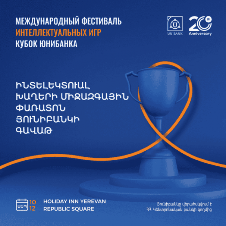 Հասարակություն2021թ.-ի սեպտեմբերի 10-12-ը Երևանում տեղի կունենա «Յունիբանկի գավաթ» ինտելեկտուալ խաղերի միջազգային փառատոն: Միջոցառումը նվիրված է Յունիբանկի գործունեության 20-ամյակին: