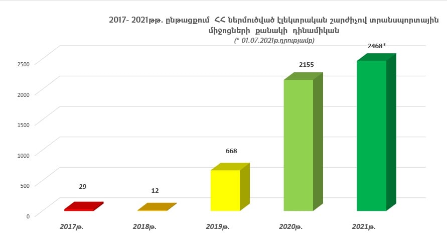 Արդյունքում՝ 2021 թվականի 1-ին կիսամյակի ընթացքում ՀՀ տարածք ներմուծված բացառապես էլեկտրական շարժիչով տրանսպորտային միջոցների ներկրումը Հայաստան շեշտակի ավելացել է: