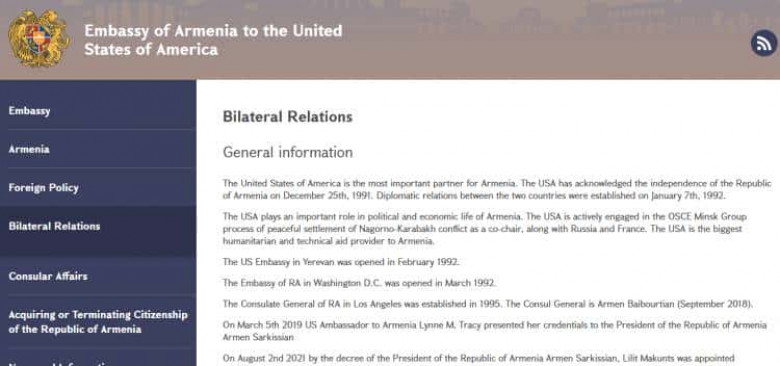 ՄամուլԱՄՆ-ում Հայաստանի դեսպանության պաշտոնական կայքէջում, ինչպես նաեւ ֆեյսբուքյան պաշտոնական էջում սեւով ապիտակի վրա գրված է, որ ԱՄՆ-ն Հայաստանի կարեւորագույն գործընկերն է: Ոչ թե կարեւոր գործընկերներից մեկը, այլ հենց կարեւորագույնը: Այսինքն` Ռուսաստանը չէ մեր ռազմավարական գործընկերը, Իրանը չէ, Վրաստանն ու Ֆրանսիան էլ չեն, հենց ԱՄՆ-ն է: Նման խայտառակ ձեւակերպումը, իհարկե, կա՛մ ոչ կոմպետենտության հետեւանք է, կա՛մ էլ հատուկ արված սադրանք` Ռուսաստանի եւ Իրանի նկատմամբ: Երկու դեպքում էլ սա դիվանագիտական սկանդալ է: ԱԳՆ մեր աղբյուրների փոխանցմամբ՝ էջի ադմինիստրացիայով զբաղվում է հենց դեսպանությունը, եւ նման ձեւակերպումը հենց դեսպանությունն է տվել: