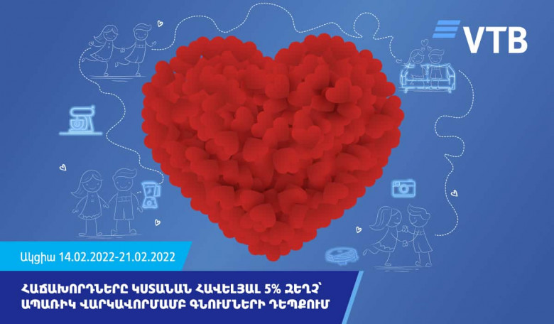 ՀասարակությունՄինչև փետրվարի 21-ը ՎՏԲ-Հայաստան Բանկի գործընկեր կազմակերպությունների վաճառակետերում ապառիկ վարկավորմամբ գնումներ կատարելու դեպքում հաճախորդները կստանան զեղչ: Զեղչը կկազմի վարկի գումարի 5%-ը: