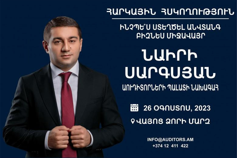 «Աուդիտորների Պալատ»-ի նախագահ Նաիրի Սարգսյանի «ՀԱՐԿԱՅԻՆ ՀՍԿՈՂՈՒԹՅՈՒՆ» թեմայով հերթական դասախոսությունը տեղի կունենա օգոստոսի 26-ին Վայոց ձորի մարզում