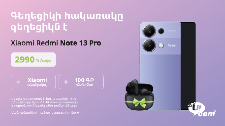 Մարտի 4-ից ապրիլի 15-ը բոլոր հաճախորդները միայն Ucom-ի վաճառքի և սպասարկման կենտրոններում կարող են ձեռք բերել Xiaomi Redmi Note 13 Pro սմարթֆոնը՝ ամսական վճարելով 2990 դրամ: Սմարթֆոնի հետ կտրամադրվի Xiaomi Redmi անլար ականջակալ և գեղեցիկ հեռախոսահամար՝ Level Up 1800 փաթեթով։ Փաթեթն առաջին ամիսը կլինի անվճար, հետը նաև կտրամադրվի 100 ԳԲ ինտերնետ, որը հասանելի կլինի 6 ամսվա ընթացքում։ Հեռախոսի գինը կանխիկ գնելու դեպքում 143.500 դրամ է: