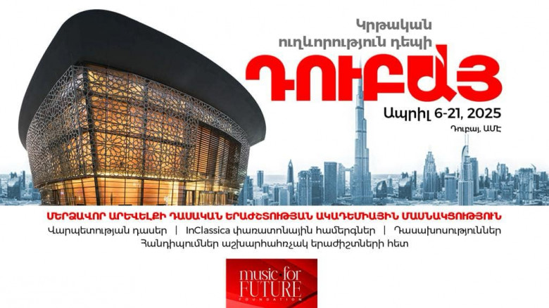 ՄշակույթՕրերս տեղեկացրել էինք, որ Մերձավոր Արևելքի դասական երաժշտության ակադեմիան Հայաստանի «Երաժշտություն հանուն ապագայի» հիմնադրամի հետ միասին առաջարկում են ճանապարհորդության բացառիկ հնարավորություն: Հիմնադրամն արդեն երրորդ անգամ նախաձեռնում է «Կրթական ուղևորություն» դեպի Արաբական Միացյալ Էմիրություններ, մասնավորաբար՝ Դուբայ քաղաք՝ Մերձավոր Արևելքի դասական երաժշտության ակադեմիային (Middle East Classical Music Academy-MECMA) մասնակցելու նպատակով, որն անցկացվելու է 2025 թ․-ի ապրիլի 6-ից 21-ը։