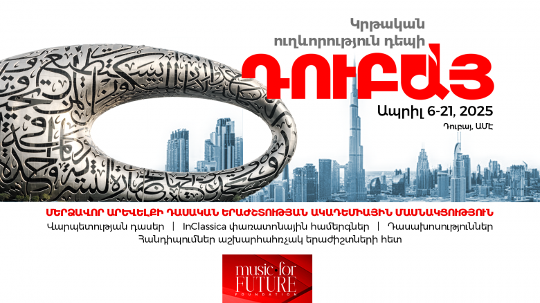 ՄշակույթՄերձավոր Արևելքի դասական երաժշտության ակադեմիան «Երաժշտություն հանուն ապագայի» հիմնադրամի հետ միասին առաջարկում են ճանապարհորդության բացառիկ հնարավորություն: Հիմնադրամն արդեն երրորդ անգամ նախաձեռնում է «Կրթական ուղևորություն» դեպի Դուբայ: Ակադեմիան անցկացվելու է 2025 թ․-ի ապրիլի 6-ից 21-ը։