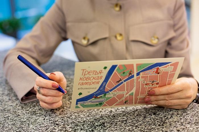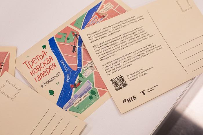 Հիշատակի բացիկը ստեղծվել է նկարազարդող Աննա Վասիլևայի կողմից, որը հայտնի է մանկական գրքերի և թատրոնի աֆիշաների համար իր աշխատանքներով, ինչպես նաև իր թեթև ու ինքնաբուխ նկարչական ոճով։ 2021թ․-ին նա ընդգրկվել է World Illustration Awards ամենահեղինակավոր միջազգային մրցանակի կարճ ցուցակում (shortlist)։ Հաշվի առնելով, որ Տրետյակովյան պատկերասրահը մայրաքաղաքում ունի շենքերի և մասնաճյուղերի բավականին ընդարձակ աշխարհագրություն՝ բացիկի սյուժեն ստացվել է ինքնին․ ցույց է տալիս նոր մասնաշենքի գտնվելու վայրը Մոսկվայի քարտեզի վրա՝ մնացած բոլոր մասնաճյուղերի նկատմամբ, իսկ ավելի կոնկրետ՝ Յակիմանկա թաղամասը, որտեղ կենտրոնացած է շենքերի մեծ մասը: Այսպիսով, նոր մասնաշենքում առաջին ցուցահանդեսի այցելուներին մնաց հուշանվեր՝ հիշեցնող ոչ միայն խորհրդանշական ցուցահանդես, այլև թանգարանի նոր մասնաշենք նրանց այցելության մասին, որի բացումը գրեթե 20 տարվա շինարարությունից հետո դարձավ պատմական իրադարձություն Ռուսաստանի մշակութային կյանքում.