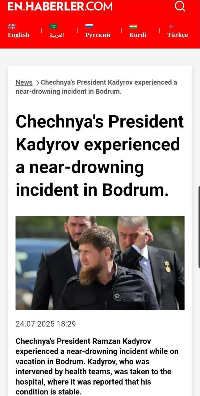 Չեչնիայի նախագահ Ռամզան Կադիրովը քիչ է մնացել խեղդվի Մուղլա նահանգի Բոդրում քաղաքում հանգստանալիս։ Նրան շտապօգնության մեքենայով տեղափոխել են հիվանդանոց։ Կադիրովի վիճակը գնահատվում է կայուն, հաղորդում է Haberler-ը։