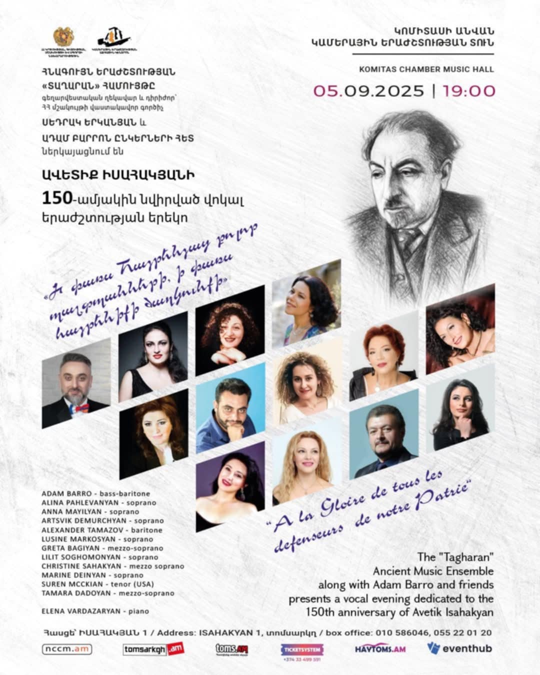 Սեպտեմբերի 5-ը կլինի երաժշտական պատմական օր մեր հայրենակիցների համար, բացահայտելու գյումրեցի Հայ Մեծագույն գրող Ավետիք Իսահակյանի խոսքերով Հայ հիասքանչ կոմպոզիտորների կողմից գրված հատընտիր ստեղծագործությունների վոկալ երաժշտության Գալա Համերգ՝ վարպետի 150-ամյակին նվիրված անակնկալներով լեցուն մշակութային երեկոն կբացահայտեք մեր տաղանդաշատ օպերային Արտիստների մեկնաբանությամբ …