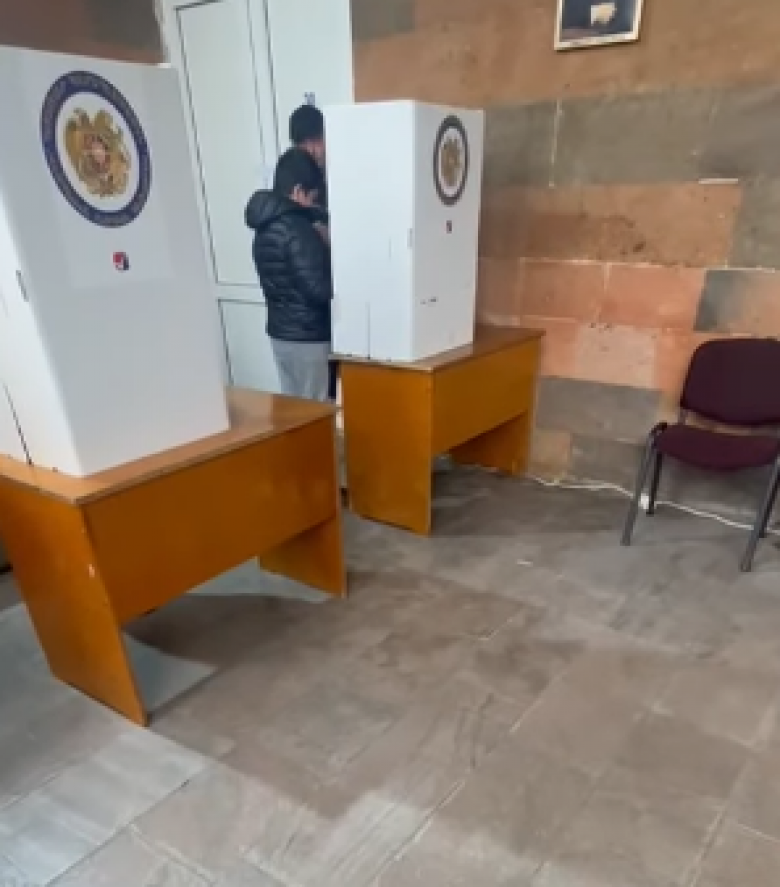 14/12 տեղամասում ընտրողը նկարահանում է ծրարը: Քվեախցիկում երեխայի հետ է