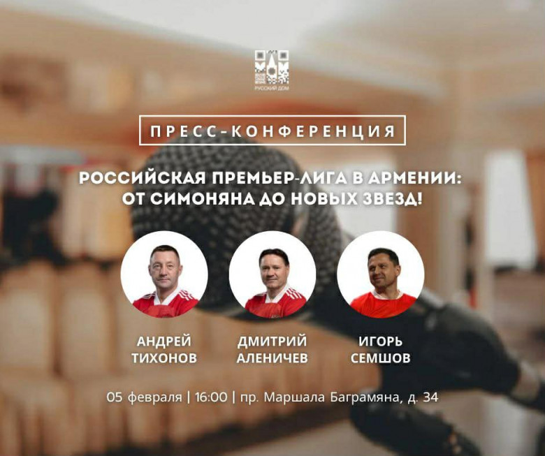 Փետրվարի 3-ից 6-ը, «Ռոսսոտրուդնիչեստվոյի» և Երևանի Ռուսական տան աջակցությամբ Ռուսաստանի ֆուտբոլային միության և Պրեմիեր լիգայի ներկայացուցիչները կլինեն Երևանում: Այդ ժամանակահատվածում նախատեսվում է Ռուսաստանի և Հայաստանի միջև սպորտային համագործակցության զարգացմանն ուղղված մի շարք միջոցառումներ անցկացնել: Ռուսաստանյան պատվիրակության կազմում են ռուսական ֆուտբոլի լեգենդներ Անդրեյ Տիխոնովը, Դմիտրի Ալենիչևը և Իգոր Սեմշովը, ինչպես նաև ՌՖՄ և ՌՊԼ այլ ներկայացուցիչներ: