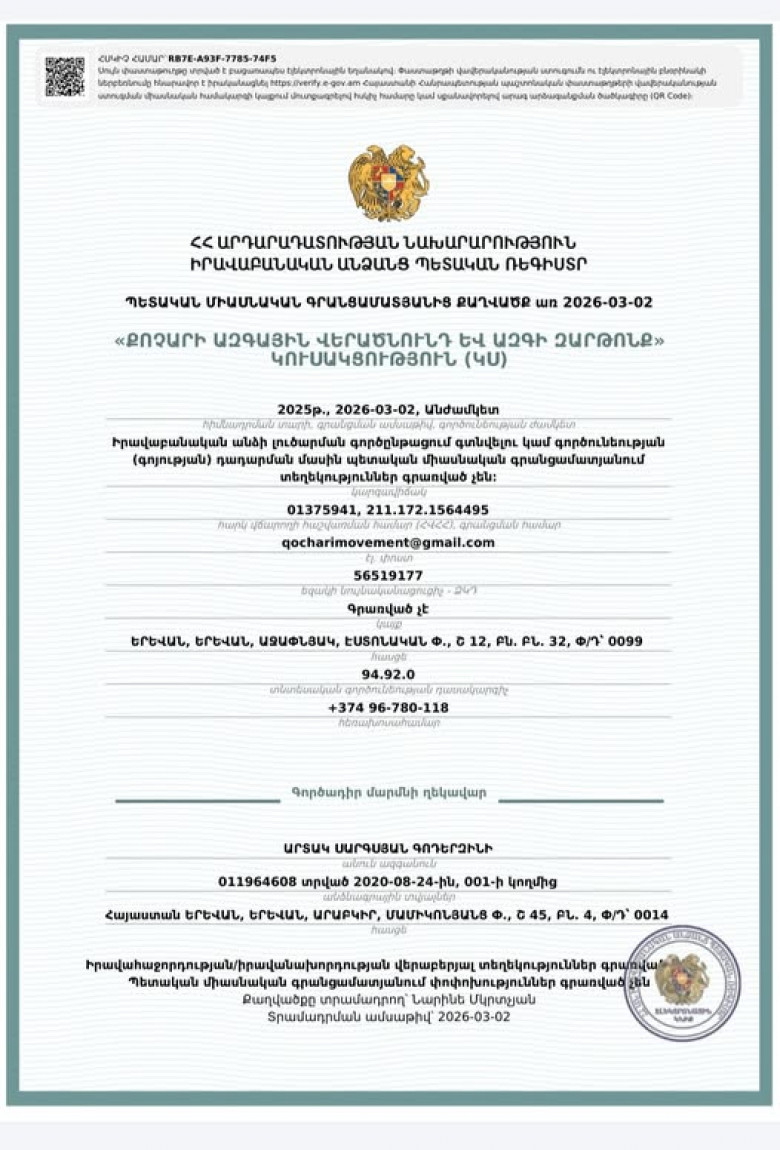 Դե՞ղ, թե՞ հաց. մեր հայրենակիցները, ցավոք, հաճախ այս այլընտրանքի առաջ են կանգնում. Նարեկ Կարապետյան«Ուժեղ Հայաստան»-ն իշխանություններին մեղադրել է Նարեկ Կարապետյանի ֆեյսբուքյան էջի վրա հարձակումների մեջ Թոշակների բարձրացումը նախընտրական քայլ է և կարող է դիտարկվել որպես ընտրակաշառք․ Ավետիք ՉալաբյանՍահմանամերձ գյուղերի հիսունհինգ դպրոց կփակվի․ Մենուա ՍողոմոնյանՆարեկ Կարապետյանի ուղիղ եթերըԱյս Կուսակցության գրանցումով ես ինձ հետ չեմ տանում ո՛չ զայրույթ, ո՛չ ափսոսանք, միայն երախտագիտություն. Արտակ ՍարգսյանՄենք չենք մտնելու պոպուլիզմի դաշտ․ Նաիրի ՍարգսյանՏեղ հասա՞վ, որ Իրանի ժողովրդին պետք է ցավակցել. Արշակ ԿարապետյանՀաճախորդների շնորհակալության օր Էջմիածին մասնաճյուղում․ IDBankԱռաջիկա երկու տարիներին իջեցնելու ենք դեղերի գները 30%-ով․ Հրայր ԿամենդատյանԱրցախի հարցը և արցախահայերի իրավունքները «ՀայաՔվեի» ուշադրության կենտրոնում են․ Ավետիք Քերոբյան.Փաշինյանի թույլ կառավարությունը վախենում է նույնիսկ Ֆեյսբուքյան էջից. Մարիաննա Ղահրամանյան «Ucom Ֆելլոուշիփ» ինկուբացիոն ծրագրի մասնակիցներն այցելեցին Ucom 250 օր զրպարտված և ապօրինի կալանավորվածԴուխ հավաքիր ու ցավակցիր հարևանիդ. երեխաներ են զոհվում, հասկացիր․ Արշակ ԿարապետյանOzon Հայաստան-ի շրջանառությունը 2025 թվականին աճել է գրեթե 1,5 անգամ Նկատվում է կենսաթոշակային տարիքը բարձրացնելու միտում. Դավիթ ՀակոբյանՓաշինյանը «Մարտի 1»-ն օգտագործելու է քարոզչական նպատակներով Իրանի դեմ պատերազմը անդառնալիորեն փոխում է տարածաշրջանի պատկերը Փաշինյանը շարունակում է խուսանավել մոդուլային ատոմակայանի հարցում Ստեղծվել են արևային վահանակներ, որոնք էներգիա են ստանում նաև անձրևի կաթիլներից Վանաձորում բախվել են «Opel Zafira»-ն և «Opel Vectra»-ն. կա 9 վիրավnր Այս օրերի իրադարձությունների ծանր հետևանքները տասնամյակներով զգացնել են տալու տարածաշրջանի, այդ թվում` Հայաստանի վրա․ Տիգրան Աբրահամյան Մերձավոր Արևելքում ստեղծված իրավիճակի հետևանքով չեղարկվել են մի շարք չվերթեր դեպի Երևան և Երևանից Թրամփը կարծում է, որ Իրանում ռшզմական գործողությունը կարող է տևել մինչև մեկ ամիս Ինչպե՞ս երկպալատ պառլամենտը կարող է նպաստել ժողովրդավարությանն ու օրենքի գերակայությանըՀանքաքարի մատակարարումից մինչև մանրացում՝ ԶՊՄԿ-ում ամերիկյան աղացները ձևավորում են արտադրության հզոր ռիթմըԵթե այս պատերազմը երկարի, ապա ծայրահեղ ծանր իրավիճակ կարող է լինել միջազգային առևտրի, բիզնեսի, ֆինանսական, նավթային, գազային շուկաների համար. ՄարուքյանՔպ վարչախումբը գողանում է հայաքվեի մտքերը. Հրայր ԿամենդատյանԱյն մասին, թե ինչու ենք մենք միավորում մեր ուժերը այլ գաղափարակից կառույցների հետ, և ինչու է դա բերելու հաջողության առաջիկա ընտրություններին. Չալաբյան20 000 մատչելի բնակարան պետական աջակցությամբ. Գոհար ՂումաշյանԱնկայուն աշխարհի ֆոնին՝ խորացող ներքին ճգնաժամ Հայաստանի թեկնածուն. «Միասնության թևերը» ներկայացրեց իր քաղաքական օրակարգը ԶՊՄԿ-ն` Կանադա-Եվրասիական պալատի անդամ. հանքարդյունաբերության ոլորտում նոր էջ է բացվումՄոտ 500,000 մարդ չունի արժանապատիվ աշխատանք. հաջորդ վարչապետ Սամվել Կարապետյանը շուտով կփոխի այս իրավիճակըՄհեր Ավետիսյանը առաջարկել է Իրանի դեսպանատան առջև ծաղիկներ, մանկական խաղալիքներ տեղադրենք«Ինտերը» տանը հաղթեց «Ջենոային»․ Մխիթարյանը՝ գոլային փոխանցման հեղինակ Սարդար Վահիդին նշանակվել է Իսլամական հեղափոխության պահապանների կորպուսի (ԻՀՊԿ) նոր հրամանատարՄենք Իրանին կհարվածենք այնպիսի ուժով, որպիսին նախկինում երբեք չի տեսնվել․ Թրամփ Քասախում «ՎԱԶ 2107»-ը բախվել է «Առողջ այգու» պարսպին․ կան վիրավորներ