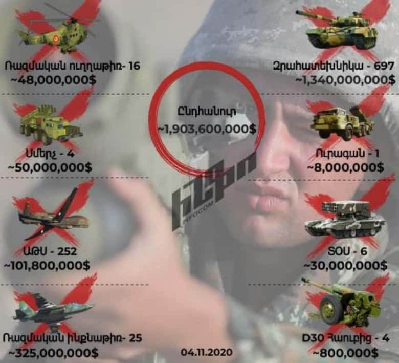 ՀասարակությունՆոյեմբերի 4-ի դրությամբ՝ Ադրբեջանն արդեն կրել է 1,903,600,000,դոլարի կորուստ: Infocom-ը ներկայացնում է Ադրբեջանի կորուստները՝ դրամական արտահայտությամբ։