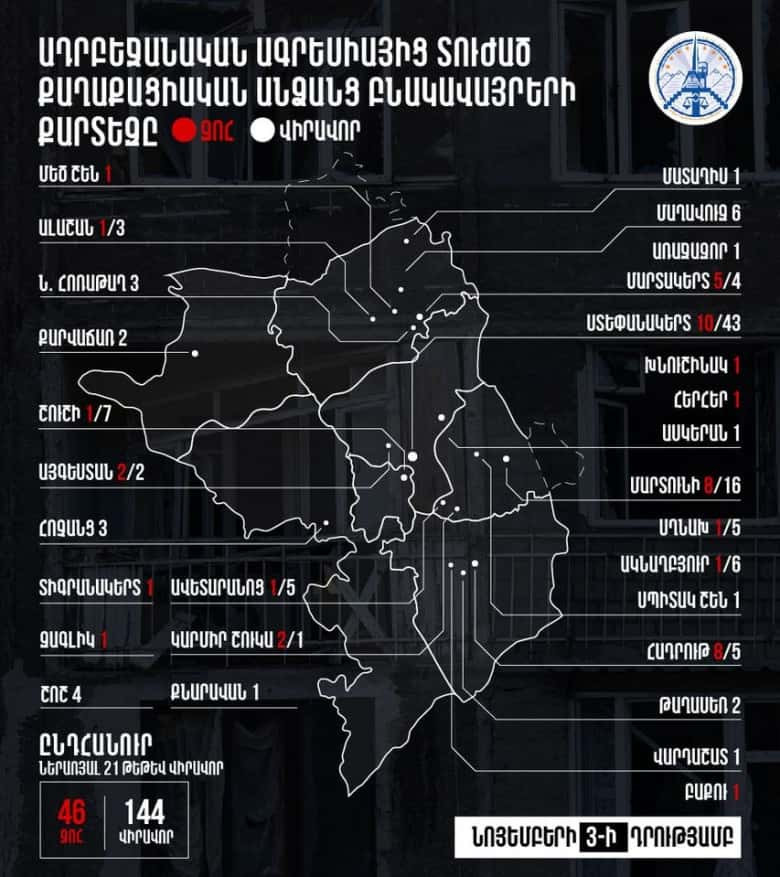 ՔաղաքականությունՄինչև նոյեմբերի 3-ը ներառյալ Ադրբեջանի կողմից քաղաքացիական բնակավայրերի թիրախավորման արդյունքում սպանվել է ընդհանուր 46 խաղաղ բնակիչ, որից 1 մանկահասակ աղջիկ, 7 կին և 38 տղամարդ: Մարմնական վնասվածքներ է ստացել ընդհանուր առմամբ 144 մարդ, որից 123 անձ ստացել է լուրջ վնասվածքներ: Վերջիններից 104-ը արական, իսկ 19-ը` իգական սեռի քաղաքացիներ են:
