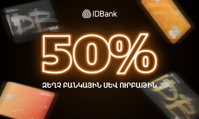 ОбществоՍև ուրբաթին ընդառաջ՝ նոյեմբերի 10-ից դեկտեմբերի 1-ը ներառյալ, պատվիրե՛ք IDBank-ի Visa Gold, Travel, Visa Platinum, Mastercard Standard քարտերը և ստացե՛ք 50% զեղչ քարտերի գործողության ողջ ժամանակահատվածի համար։