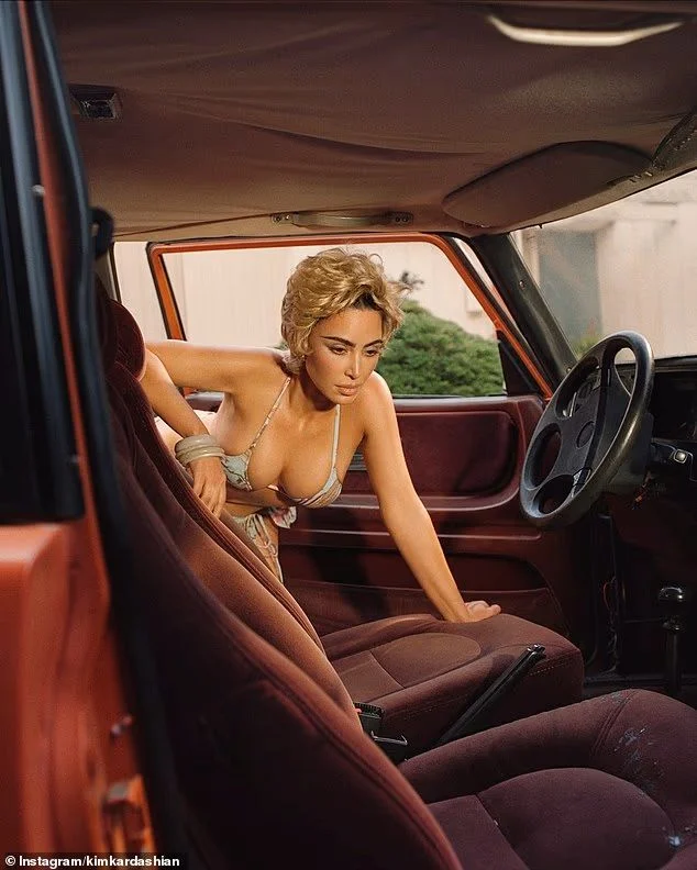 На снимках Ким практически неузнаваема — вместо привычных тёмных локонов она предстала с коротким кудрявым блонд-бобом. В одном из образов Кардашьян позирует в слитном купальнике с тигровым принтом и глубоким вырезом. Образ дополнили широкая красная повязка на голову, золотые серьги и массивный браслет.