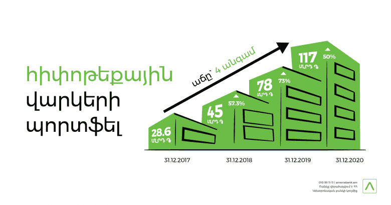 Նշենք, որ վերջին տարիներին Բանկի հիփոթեքային պորտֆելը շարունակաբար աճել է: Եթե 2018 թվականի տարեվերջին հիփոթեքային վարկավորման ծավալները կազմել են 45 մլրդ դրամ, ապա 2019թ.-ի նույն ժամանակահատվածի դրությամբ այն աճել է` հասնելով ավելի քան 78 մլրդ դրամի, իսկ 2020 թ.-ին նշված ցուցանիշը կազմել է շուրջ 117 մլրդ դրամ: Բանկի հիփոթեքային վարկավորման ծավալները 2020թ.-ին` 2019թ.-ի համեմատ աճել են 50 տոկոսով: