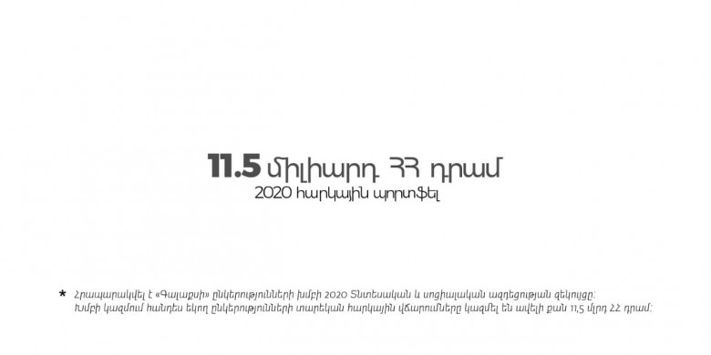 Հայաստանի խոշոր հարկատուներից ու գործատուներից «Գալաքսին», որը համախմբում է 15 բիզնես միավոր, հրապարակել է 2021թ. տնտեսական և սոցիալական ազդեցության տարեկան զեկույցը, որում ներկայացված են ընկերությունների խմբի 2020թ. հարկային և վարկային պորտֆելը, աշխատակիցների թիվն ու աշխատավարձային ֆոնդը, երկրի ՀՆԱ-ի վրա ազդեցության տվյալներ և կարևոր այլ տեղեկատվություն։