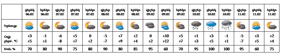 Երևան քաղաքում փետրվարի 6-ի ցերեկը, 7-9-ը, 11-ին սպասվում է առանց տեղումների եղանակ: Փետրվարի 10-ին սպասվում են տեղումներ: