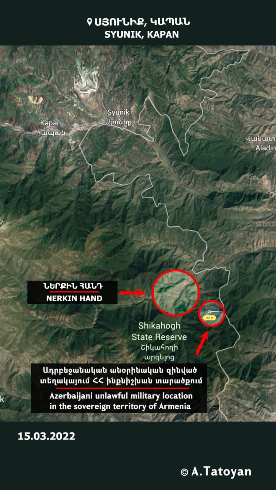 ՀասարակությունԱյս պահին կա Հայաստանի տարածք ադրբեջանական զինված ոչ թե 3, այլ 4 ներխուժում։ Այս մասին ֆեյսբուքյան իր էջում գրառում է արել ՀՀ մարդու իրավունքների նախկին պաշտպան Արման Թաթոյանը։