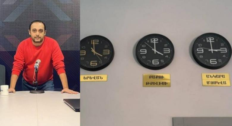 ՔաղաքականությունՀանրային ռադիոյի լրատվական ծառայությունում երեկ՝ Արցախի հայաթափման օրը քստմնելի իրադարձություն է եղել: Հանրային ռադիոյի նորանշանակ տնօրեն Արմեն Քոլոյանը, ռադիոյի նյուզռումում տարբեր երկրների ժամանակը ցույց տվող ժամացույցներ է կպցրել պատին, և այդ ժամացույցների մեջ կան նաև մեր թշնամական երկու պետությունների՝ Ադրբեջանի և Թուրքիայի ժամանակը ցույց տվող ժամացույցներ։