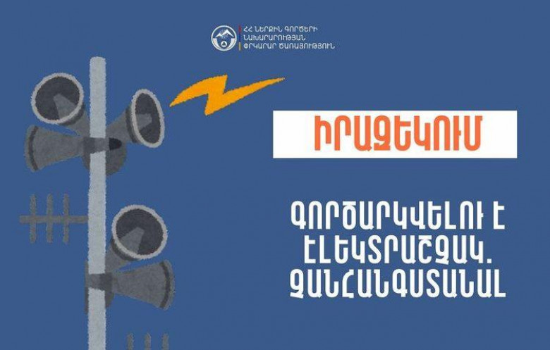 ՀասարակությունՆոյեմբերի 22-ին Լոռու մարզի Սպիտակ համայնքի Գեղասար բնակավայրում անցկացվելու է ««Օդային տագնապ» ազդանշանի դեպքում բնակչության պատսպարում» թեմայով գործնական պարապմունք, որի ընթացքում՝ ժամը 12:00-ին, գործարկվելու է էլեկտրական շչակ: