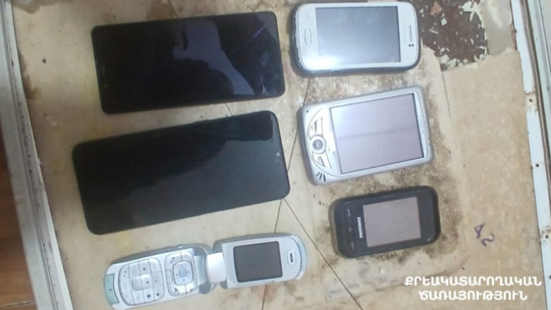 Իրականացված միջոցառումների արդյունքում կալանավորված անձի անվամբ քաղաքացու կողմից բերված սառնարանի դռան մեջ պատրաստված թաքստոցից հայտնաբերվել են 6 բջջային հեռախոս և մեկ բաժանորդային քարտ։