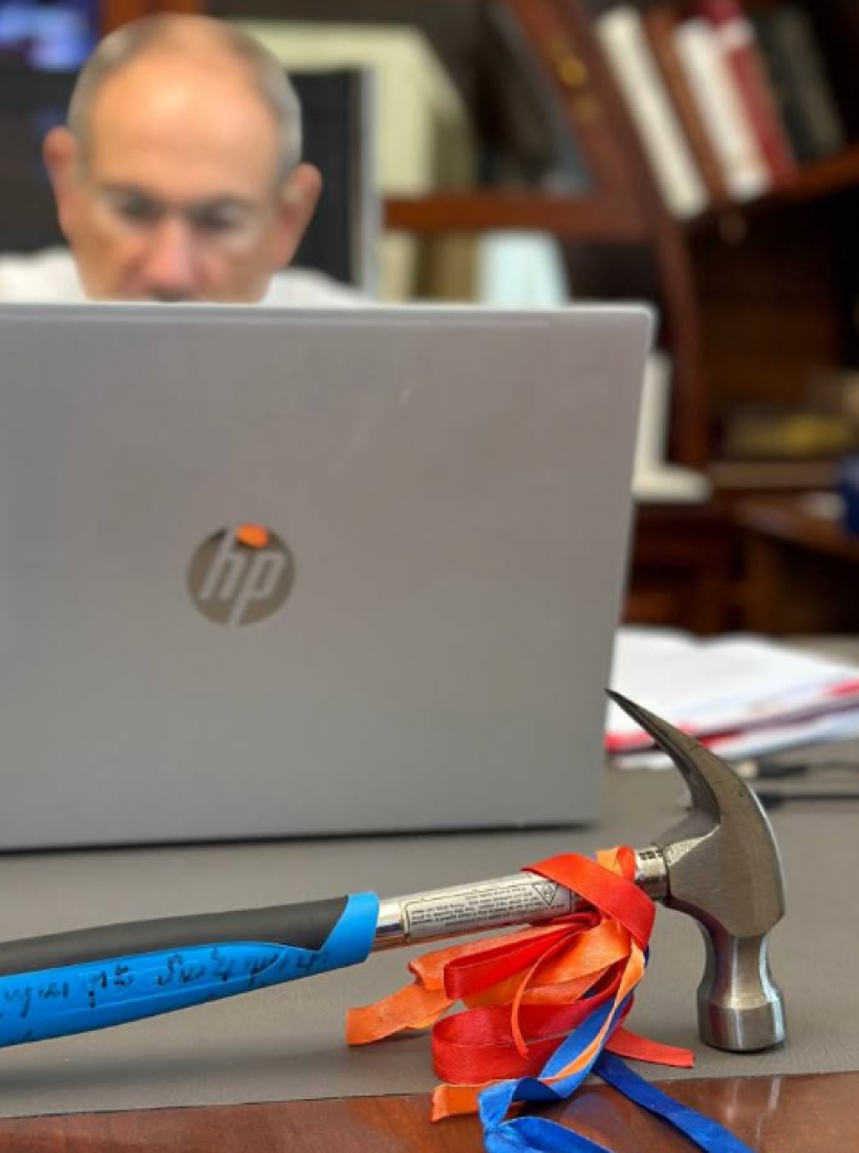 Փաշինյանը նաև լուսանկար է հրապարակել, որտեղ առաջին պլանում 2021 թ․ քարոզարշավին օգտագործած իր մուրճն է։ Ինչ խոսք, չափազանց խորհրդանշական։