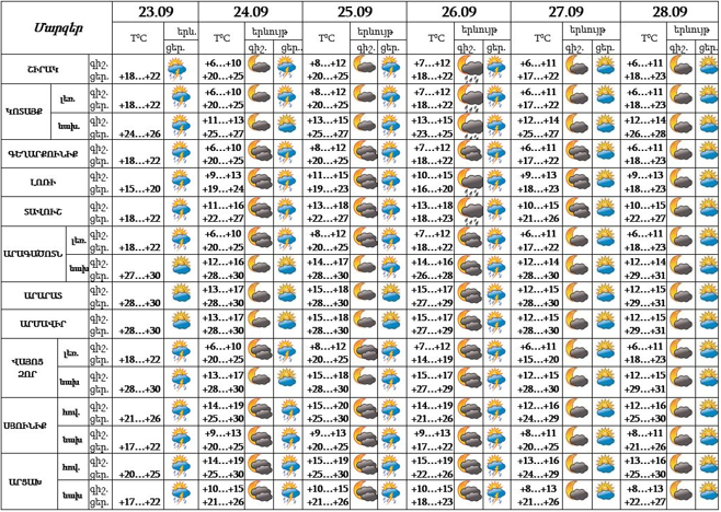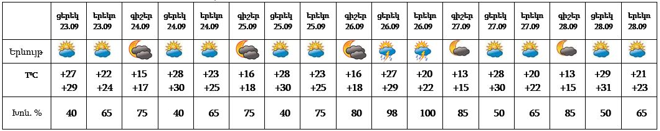 Երևան քաղաքում սեպտեմբերի 23-ի ցերեկը, 24-25-ը, 27-28-ը սպասվում է առանց տեղումների եղանակ: Սեպտեմբերի 26-ին քաղաքի առանձին հատվածներում սպասվում է կարճատև անձրև և ամպրոպ, ամպրոպի ժամանակ՝ քամու ուժգնացում 15-18մ/վ արագությամբ: