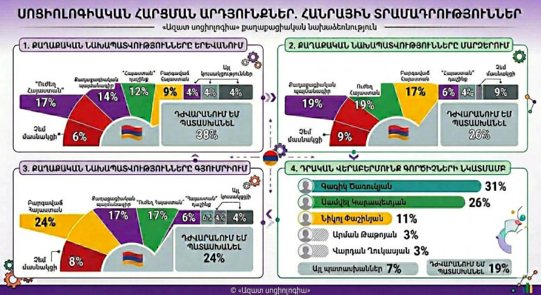 «Ազատ սոցիոլոգիա» քաղաքացիական նախաձեռնությունը ՀՀ քաղաքացիների շրջանում իրականացրել է լայնածավալ սոցիոլոգիական հարցում՝ նպատակ ունենալով պարզել հանրային տրամադրությունների արդի պատկերը և քաղաքական նախապատվությունները: