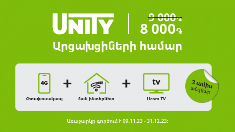 SocityWith care and commitment to social responsibility, Ucom has presented a new offer to compatriots forcibly displaced from Artsakh. Until December 31, subscribers who join the Unity 9000 regional tariff plan for the fastest home internet can use the service for free for 3 months, and if they continue the subscription, they will pay 8000 AMD instead of 9000 AMD. Unity is one of the best offers of Ucom, simultaneously providing mobile telephony, fixed Internet, 210+ TV channels, and the best devices for a comfortable daily life and always being connected.