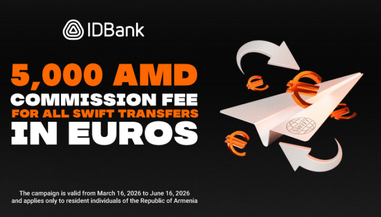 As a part of the campaign, the fee for sending SWIFT international transfers in euros is set at only AMD 5,000, regardless of the transfer amount or destination, provided the transfer is acceptable to the Bank. The offer applies to transfers made both at IDBank branches and through Idram&IDBank mobile application.