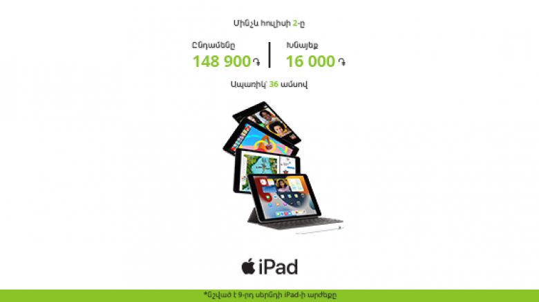 ОбществоДо 2 июля в центрах обслуживания абонентов Ucom, а также в онлайн-магазине Ucom можно будет приобрести модель iPad 10.2 9-ого поколения с объемом памяти в 64 ГБ и возможностью подключения к Wi-Fi всего за 148 900 драмов.