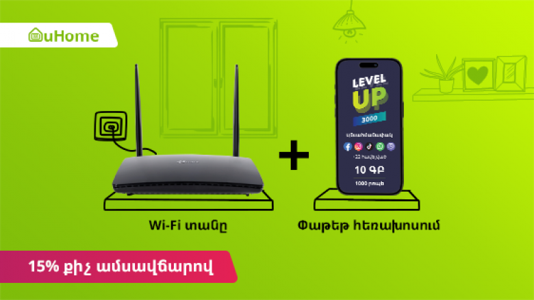 В случае подписки на тарифный пакет uHome 10000 за 10000 драмов в месяц пользователи получат безлимитный высокоскоростной интернет посредством нового устройства Wi-Fi, воспользуются всеми вложениями постоплатного тарифного плана Level Up 5500, а также получат возможность приобрести до 3-х Super SIM-карт по специальной цене.