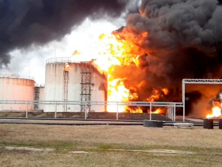 Ранее украинский мониторинговый телеграм-канал Exilenova+ сообщал об ударе по нефтебазе и опубликовал кадры, на который виден столб огня на месте удара.